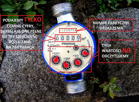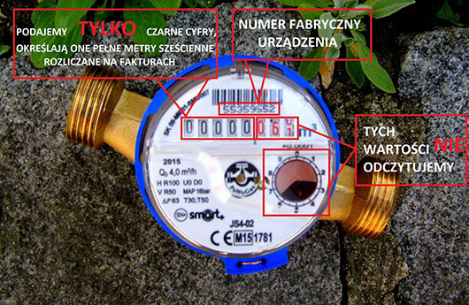 Ilość pełnych metrów sześciennych zużytej wody wskazują nam cyfry na czarnych polach. Cyfry w czerwonych polach wskazują nam wartości dziesiętne, setne i tysięczne. Dokonując odczytu podajemy tylko cyfry z czarnych pól. Poniżej przykłady dwóch rodzajów wodomierzy z opisami, co należy podać podczas dokonywania odczytu.