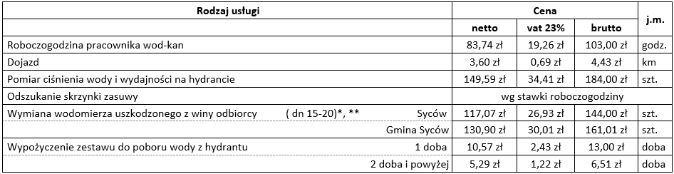 CENNIK USŁUG ŚWIADCZONYCH PRZEZ SYCOWSKĄ GOSPODARKĘ KOMUNALNĄ SP. Z O.O.